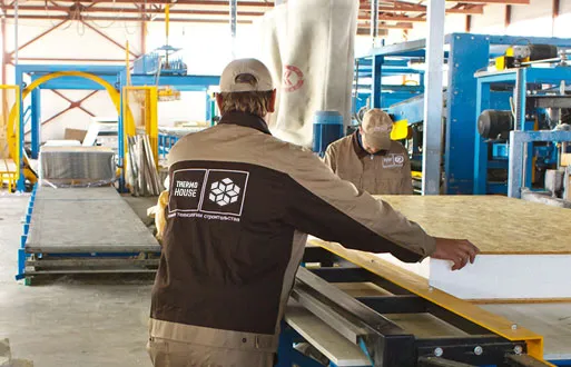 Сэндвич-панель ThermoHouse состоит из ОСП-плит и слоя пенополистирола. ОСП-плита, в свою очередь, на 90 % содержит древесную стружку, полученную при санитарной вырубке леса. Остальные 10 % составляют натуральные смолы, наполнители, отвердители и соль борной кислоты, которая усиливает защитные свойства ОСП. Из аналогичных плит изготавливается тара для фруктов, овощей и других продуктов питания.